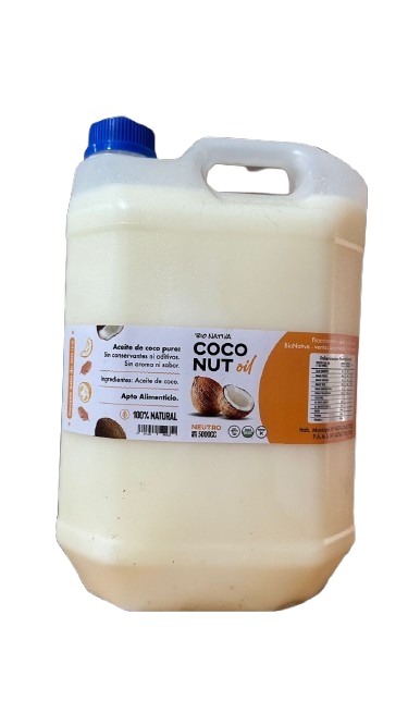 Aceite de Coco puro en Bidon de 5 litros, sabor neutro y textura ligera. Ideal para cocina, repostería, cuidado de la piel y el cabello. Libre de aditivos y 100 % natural.